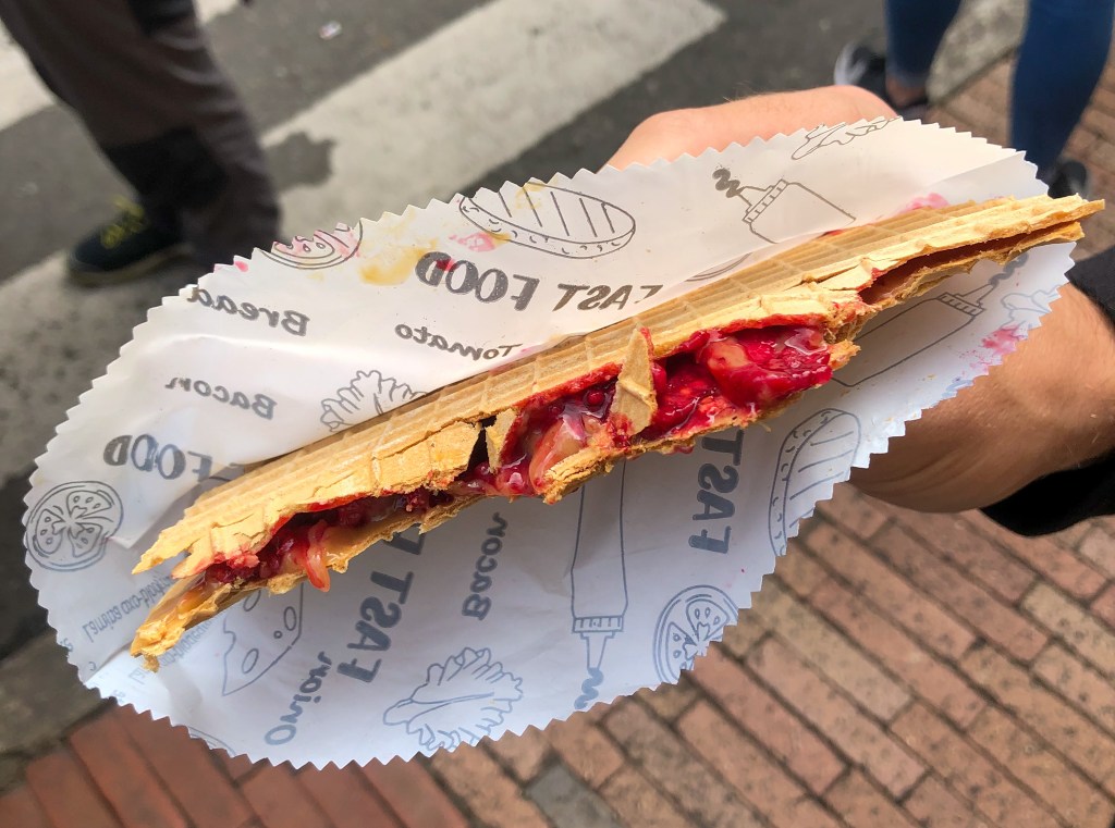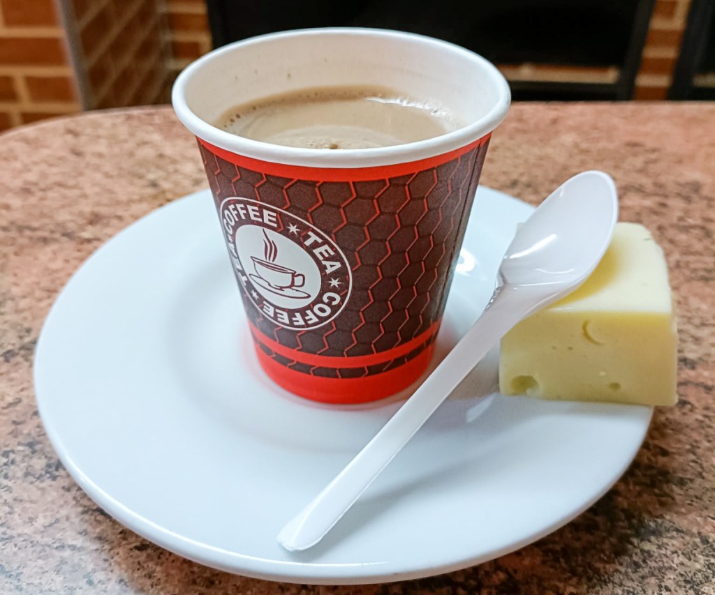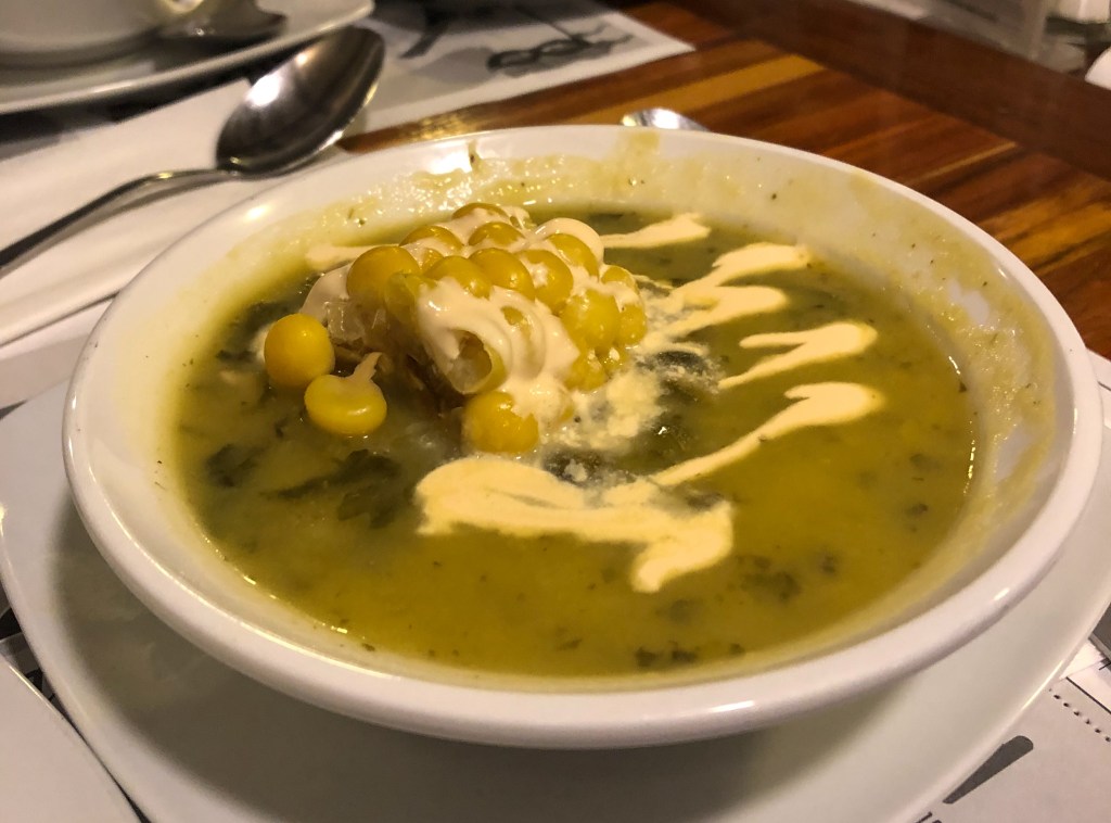 Am selben Nachmittag haben wir uns auf eine Essenstour mit «Beyond Colombia» begeben, um das Land kulinarisch noch etwas besser kennen zu lernen (was mega Sinn macht, das erst am zweitletzten Tag zu machen). An einem Nachmittag haben wir 6 Speisen verkostet, angefangen beim typischen Frühstück – einer Empanada (gefüllte, frittierte Teigtasche) und einer frittierten mit Ei gefüllten Arepa (Maisfladen). Danach gingen wir in ein Restaurant und teilten uns die Suppe Ajiaco (eher ein Eintopf mit vielen Kartoffeln, normalerweise mit Poulet, Mais, Rahm und Kapern begleitet von Reis und Avocado). Das mag nicht so speziell klingen, war aber so lecker und bis zum Schluss unser Lieblingsgericht der Tour. Im nächsten Lokal probierte Kevin ein grilliertes Capybara (eine Art sehr grosses Meerschweinchen) und ich trank eine Kokoslimonade. Danach ging es mit der Nachspeise weiter. An einem Strassenstand probierten wir Obleas (eine Art Sandwich bestehend aus zwei dünnen Waffeln gefüllt mit u.a. Dulce de Leche und einer Konfitüre), bevor wir zum Zvieri kamen. Dort wurde uns dann eine heisse Schoggi mit Käse serviert. Der Käse (ähnlich einem Luzerner Rahmkäse) wird in kleinen Stücken in die heisse Schoggi gegeben, so dass er langsam schmilzt. Für die Kolumbianer ist das offenbar völlig normal, für uns doch etwas gewöhnungsbedürftig. Kevin hat´s geschmeckt. Dazu gab es ein Gläschen Aguardiente. Unser letzter Stopp war ein Kaffeehaus, wo uns logischerweise kolumbianischer Kaffee zubereitet wurde. Dabei konnte man zwischen X Motiven aussuchen, die die Baristas dann in den Schaum zauberten. Die ganze Tour war eine tolle Erfahrung und eine andere Möglichkeit das Land besser kennen zu lernen.