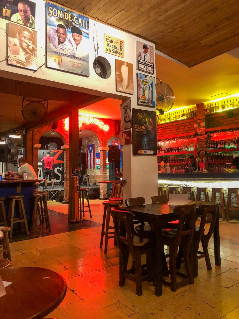 Während Céline mit dem Flugzeug via Medellin (und Panama City und Amsterdam) zurück in die Schweiz flog, stiegen Kevin und ich in den Bus nach Cali. Im Nachhinein haben wir auf der Seite des EDA’s gelesen, dass man aus Sicherheitsgründen nicht mit dem Bus nach Cali soll. Hin- und wieder seien Touristen entführt worden. Jäno, ist nichts passiert und wir sind unversehrt an unserem Ziel angekommen. Cali steht bei Kolumbienreisenden oftmals nicht auf der Liste, etwas zu Unrecht, wie wir fanden. Die Stadt verfügt in dem Sinne nicht über wirkliche Sehenswürdigkeiten (und die wenigen, die es hätte, haben wir aussen vorgelassen), ist aber bekannt als die Stadt des Salsas. Und dieser ist omnipräsent. Überall wo man hinfährt, wimmelt es von Salsa-Tanzstudios und Clubs. Abends erkundeten wir das nette Viertel San Antonio, welches viele herzige Strassen gesäumt von Restaurants und Bars hatte.