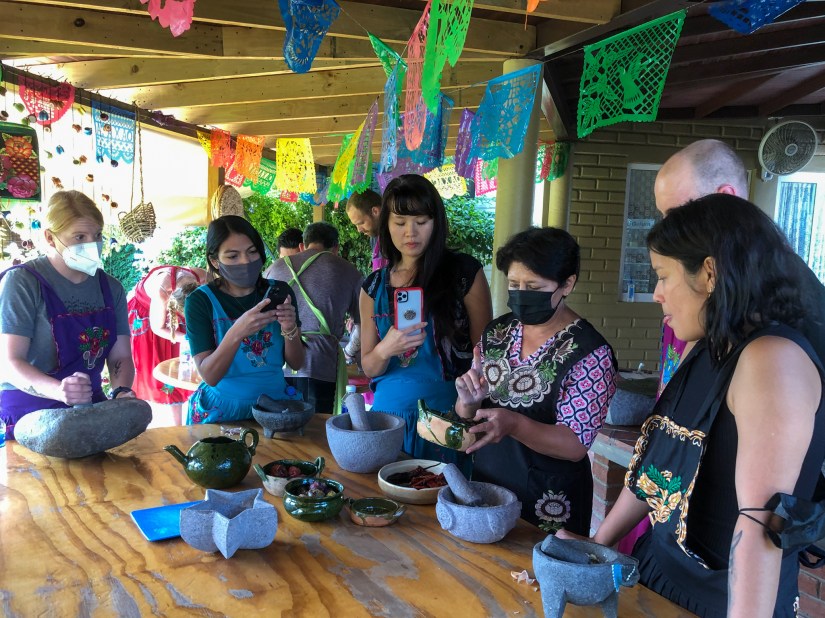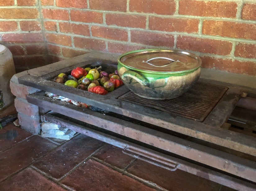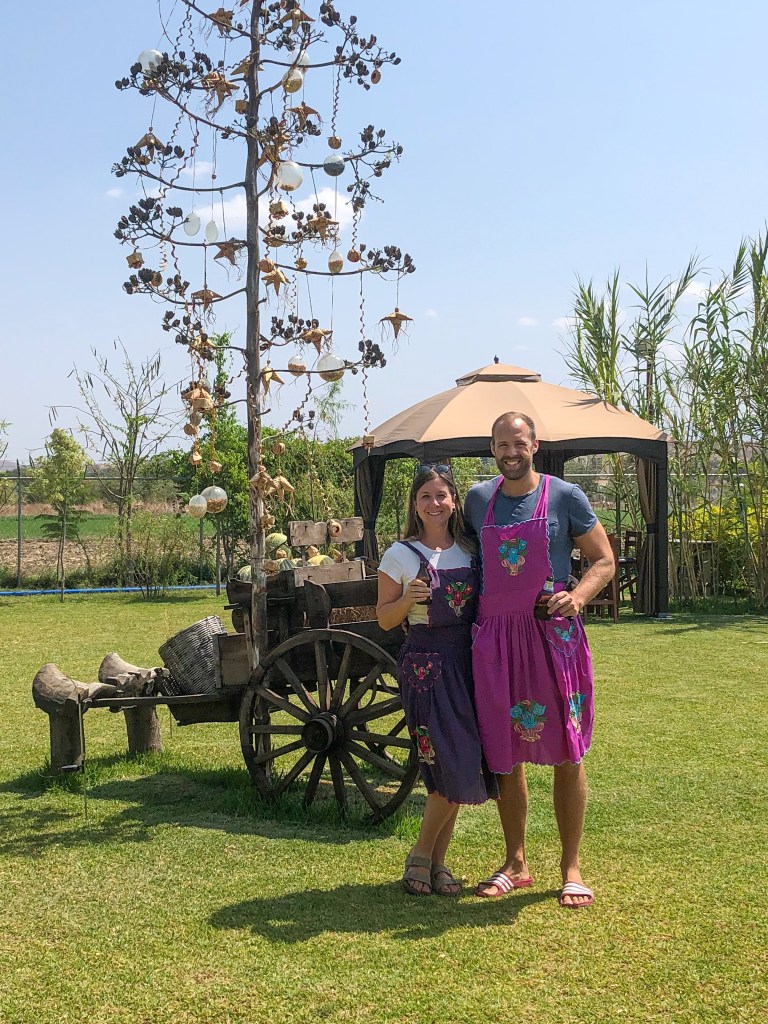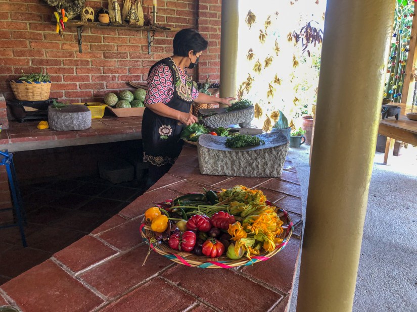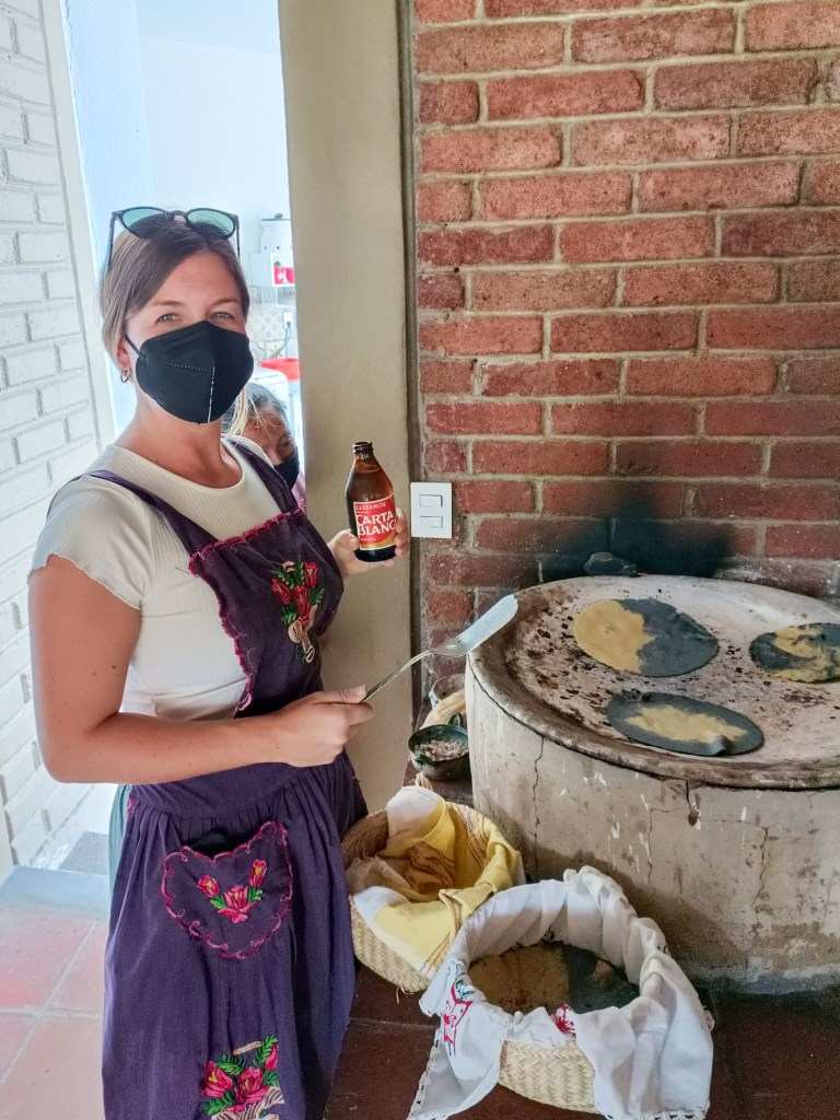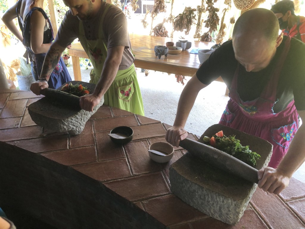 Ausgerüstet mit einer hübschen Schürze begaben wir uns in die Outdoor-Küche, die gleich an den schönen Garten der Familie gegrenzt grenzte. Zuerst haben wir die Chilis und Tomaten für die Salsas und die Mole über den Holzkohlen geröstet. Danach haben einige unserer Gruppe, die Zutaten der Mole (hauptsächlich Kräuter) auf einem Stein gemörsert (oder vermahlen, wie auch immer man den Vorgang nennen möchte). Dann stellten wir aus einem frischen Teig Tortillas her, die wir dann entweder einfach so über dem heissen Stein gegrillt oder mit dem typischen Käse von Oaxaca sowie Gemüse gefüllt und dann auch gegrillt haben. Zuletzt haben wir in einem Mörser verschiedene Salsas frisch zubereitet.