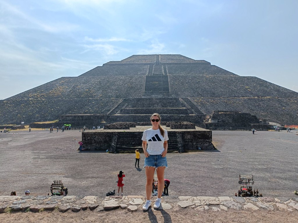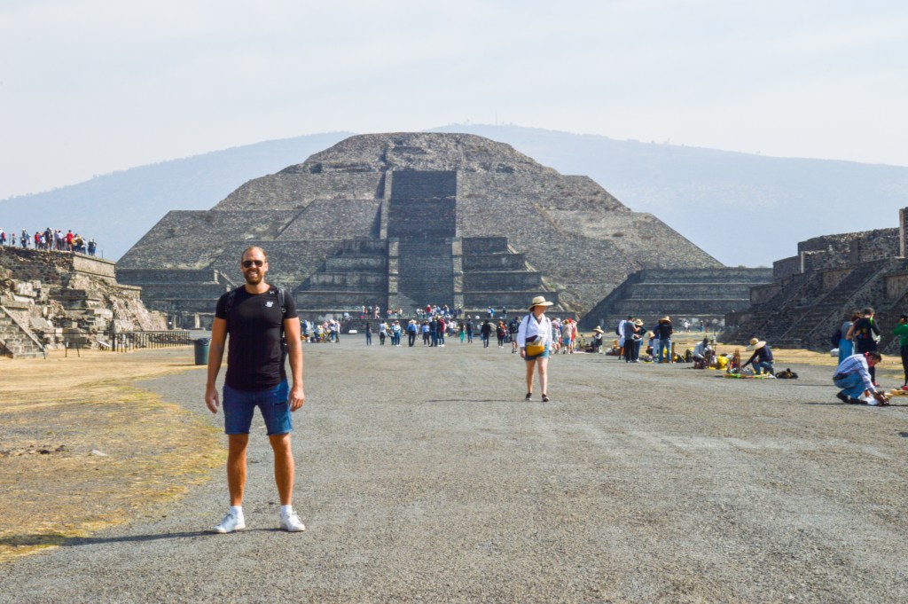 Am nächsten Morgen standen wir früh auf, um uns die Pyramiden von Teotihuacán anzuschauen. Diese liegen in der Nähe von Mexiko City und gehören zu den bedeutendsten Ruinenmetropolen Amerikas. Zuerst fuhren wir mit dem Uber zum Busterminal, worauf wir dann in den Bus wechselten, der uns zu den Pyramiden brachte. Die Fahrt wurde netterweise musikalisch von einem Herrn mit Gitarre begleitet, der nicht näher bei Kevin hätte stehen können. Nach einer Stunde und mit einem Hörschaden (zumindest Kevin) auf dem rechten Ohr, ergatterten wir uns die Parktickets (die einen Bruchteil von Chichén Itzá gekostet haben).
