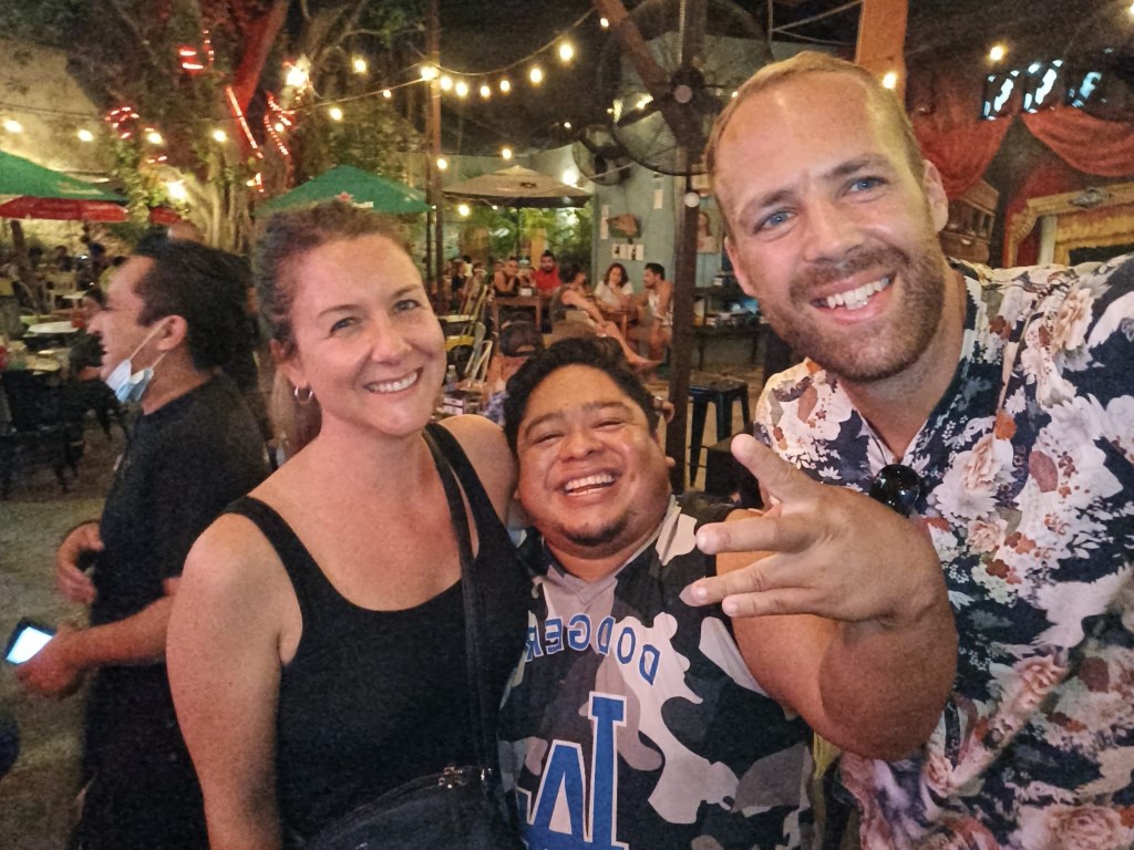 Dort lernten wir beim Sonnenbaden auch ein sehr unterhaltsames Paar kennen, wobei er über einen aussergewöhnlichen Sonnenbrand verfügte (er ist Ire). Nachdem sie ihm am Vortag den Rücken eingecremt hatte und noch 1-2 Handabdrücke auf der Vorderseite hinterliess, war er zu faul für den Rest. Man konnte eindrücklich sehen, dass selbst die Handabdrücke von Sonnencreme besser sind als gar nichts. Weil die Strandbars um 17.00 Uhr einfach alles schliessen und die Liegestühle zusammenräumen, machten wir uns dann irgendwann gemeinsam auf den Weg zu einem Taco-Restaurant, um den Tag ausklingen zu lassen.