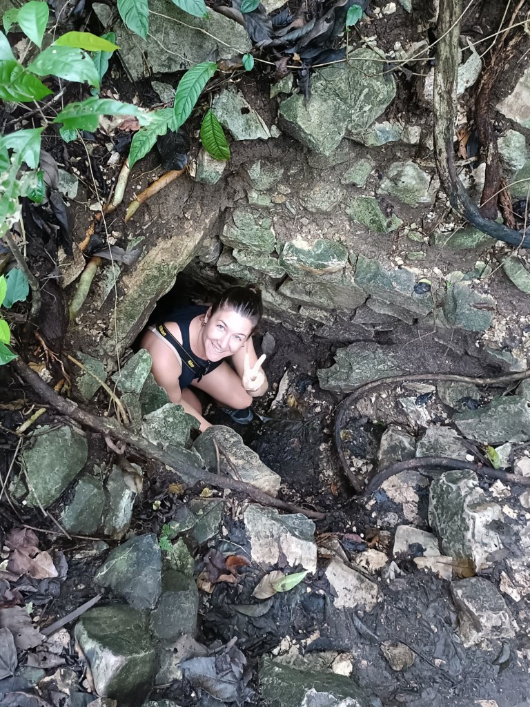 Barbara führte uns durch die Ruinen, welche im Dschungel eingebettet sind und gab diverse Informationen zu den Ruinen und den Mayas preis. Zwei Anekdoten fanden wir besonders skurril. Der Mayakalender (welcher ausserordentlich akkurat ist) hat 18 Monate zu jeweils 20 Tagen (Insgesamt 360 Tage). Jeweils anfangs August gab es einen zusätzlichen, kurzen Monat mit 5 Tagen, zu welchem Feierlichkeiten ausgetragen worden sind. Kinder, die in diesem Zeitraum geboren sind, wurden getötet, da sie die Feierlichkeiten gestört haben. Die zweite Anekdote betraf das Ballspielstadion (welches es wie auch in Chichén Itzá gab). Dort traten jeweils zwei Personen aus der Oberschicht gegeneinander an. Während der Gewinner zur Belohnung geköpft wurde, musste der Verlierer in die Unterschicht absteigen. Als Barbara unsere sichtlich entgeisterten Gesichter gesehen hat, erläuterte sie, dass es für die Oberschicht deutlich schlimmer gewesen sei, in die Unterschicht abzusteigen, anstatt zu sterben. Zudem seien die Azteken noch brutaler vorgegangen. Ah, ja denn, alles halb so schlimm 🥲.