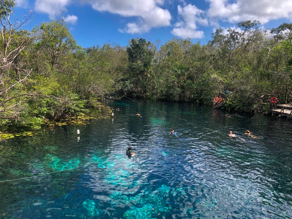 Wir haben vier Tage in Tulum geplant, wobei wir am ersten Tag in zwei der nahegelegenen Cenoten (eine Art Höhle, meistens offen, mit Grundwasserzugang) tauchen zu gehen. Zuerst besuchten wir die Cenote Angelita, welche bis zu 55 Meter tief ist. Diese ist bekannt dafür, dass sich auf rund 27 Meter unter Wasser eine Art Hydrogensulfat-Wolke befindet. Aus dieser ragt in der Mitte eine kleine Insel mit vielen Baumstämmen und Ästen, die aber teilweise auch von der Wolke erfasst werden. Dieses Erlebnis war spektakulär und mystisch, wenn auch ein bisschen beängstigend. Ausser der Wolke auf 27 Metern und einem kleinen Tunnel auf 15 Meter, gab es nicht viel mehr zu sehen.