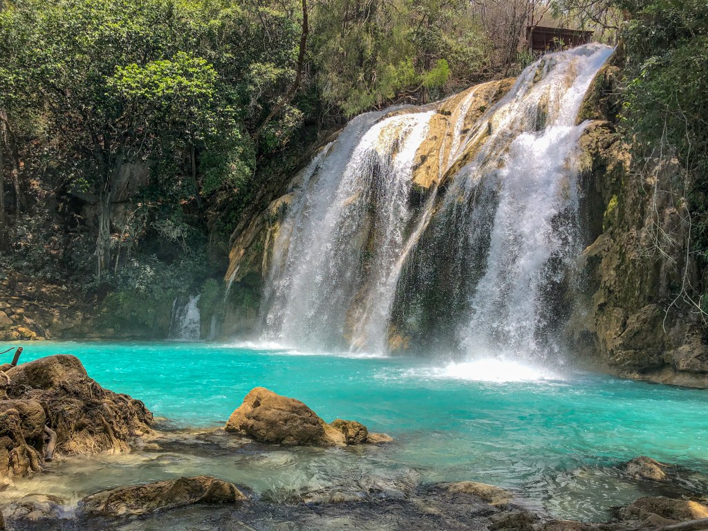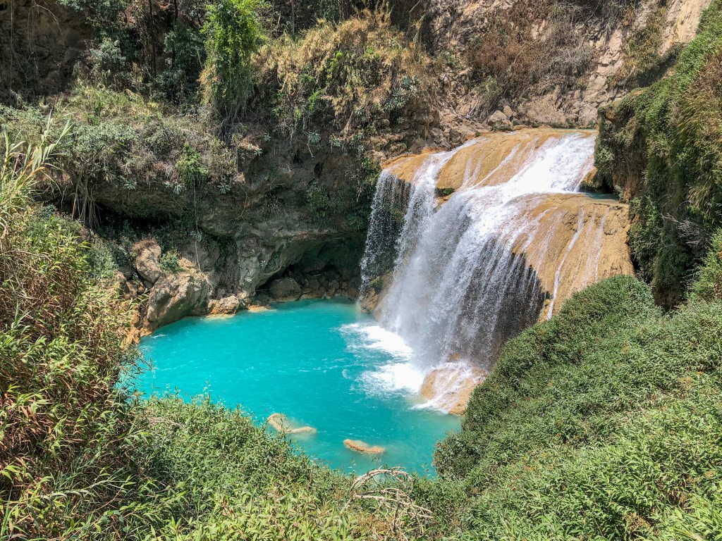 Nach weiteren 45 Minuten sind wir endlich bei den Wasserfällen angekommen und nachdem wir uns mit einer Mahlzeit versorgt hatten, nahmen wir die kleine Wanderung dem Fluss entlang in Angriff. El Chiflón ist nicht nur ein einziger Wasserfall, sondern besteht aus 7 kleineren und grösseren Wasserfällen.