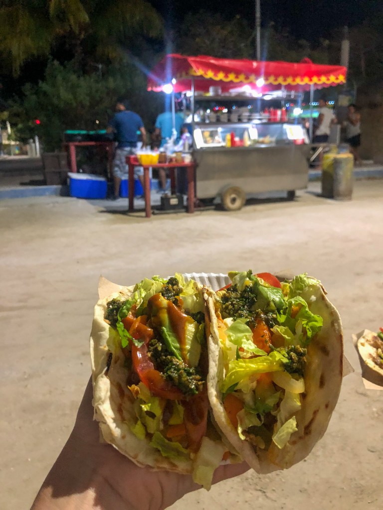 Am Folgenachmittag besichtigten wir die Maya Ruinen von Tulum, welche direkt am Meer liegen. Obwohl es vor der Kasse etwa ähnlich viele Menschen hatte wie im Tayrona National Park in Kolumbien, dauerte es zum Glück nicht mal 30 Minuten, bis wir drin waren. Die Ruinen waren ganz nett, also verbrachten wir rund eine Stunde damit die Wege abzulaufen und die unterschiedlichen, verbleibenden Gebäude zu besichtigen (von aussen versteht sich). Abends besuchten wir den «Palma Central» Streetfood Markt, wo zur gleichen Zeit ein Kult oder eine Sekte ein Fest gefeiert hat (so hat es auf uns zumindest gewirkt). Oder aber wir haben den Ort gefunden, wo sich Coachella-Festival-Besucher den Rest des Jahres aufhalten. Auf jeden Fall sahen wir viel unterhaltsames, rochen jede Menge Rauch von Räucherstäbchen und durften ganz ganz viel Liebe erfahren. Das Essen war hingegen echt gut, einfach doppelt so teuer wie auf dem einheimischen Markt.