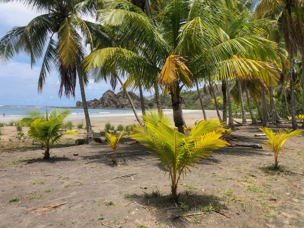 Das Küstenörtchen Samara liegt auf der Nicoya-Halbinsel an der Pazifikküste. Es dauerte etwas, bis wir die kurvenreichen Strassen von Monteverde hinter uns gelassen haben. In unserer Yoga-Unterkunft in Samara angekommen, machten wir uns gleich hungrig auf die Suche nach einem Zmittag. Unglücklicherweise haben wir uns das wohl langsamste Restaurant der gesamten Gegend ausgesucht und mussten uns in Geduld üben. Danach legten wir uns an den Strand, unter die vielen Palmen. Für unser Abendessen entdeckte ich ein französisches Restaurant in der Nähe und nötigte Mami bei abklingendem Gewitter dort hinzuspazieren. Ganz doof war es nicht, denn kaum hatte der Regen und das Gedonnere ganz aufgehört, war das Restaurant rappelvoll. Mami war etwas traumatisiert, aber glücklicherweise hat der feine, überbackene Camembert das Meiste gerichtet.
