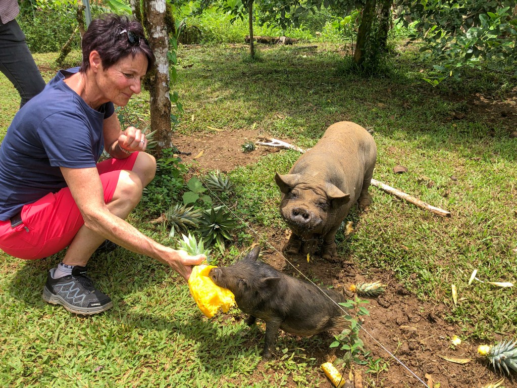 Am nächsten Morgen führte uns Alessandro, der Neffe von Rodolfo, durch die Farm und zeigte uns lokale Flora und Fauna. Wir konnten frische Ananas direkt vom Feld probieren, wobei wir die Reste den Schweinen verfüttert haben, welche sich lediglich von Ananas ernähren. Zuletzt gab es noch einen frischen Saft aus Zuckerrohr und Inger, gespickt mit etwas Rum. Anschliessend zogen wir los nach La Fortuna.