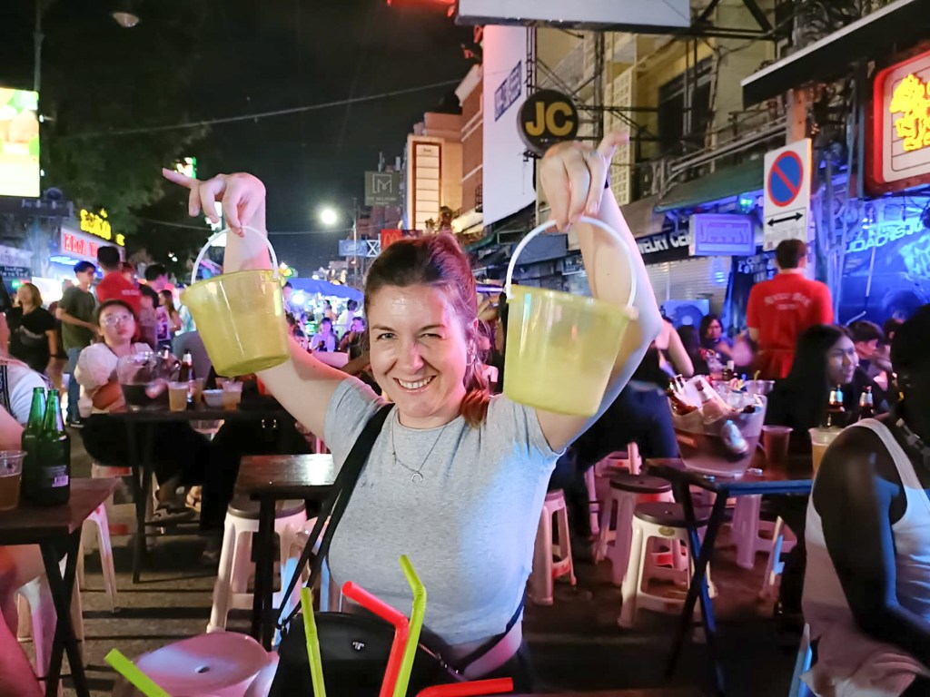 Am Abend zog es uns in die berühmt-berüchtigte Khaosan Strasse, wo sich vor allem Touristen zum Feiern wiederfinden. Nachdem wir durch die Strasse, zwischen Bars mit ohrenbetäubender Musik, gequält haben, liessen wir uns an einem Ort gleich am Ende der Strasse nieder, wo der Lärm nicht ganz so unangenehm war. Vielleicht haben wir uns dort den ein oder anderen Cocktail in Kübelform gegönnt. Die einen etwas mehr als die anderen. Vielleicht sind wir danach mit dem Tuktuk quer durch die Stadt in ein zwielichtiges Etablissement gescheppert. Vielleicht sind wir danach nochmals zurück in die Khaosan Strasse, weil wir offensichtlich noch nicht genug hatten. Und vielleicht sind wir am nächsten Morgen mit einem üblen Kater zehn Minuten vor Schluss zum Hotelfrühstück geeilt und danach wieder ins Bett gekrochen. Wer weiss 😅.