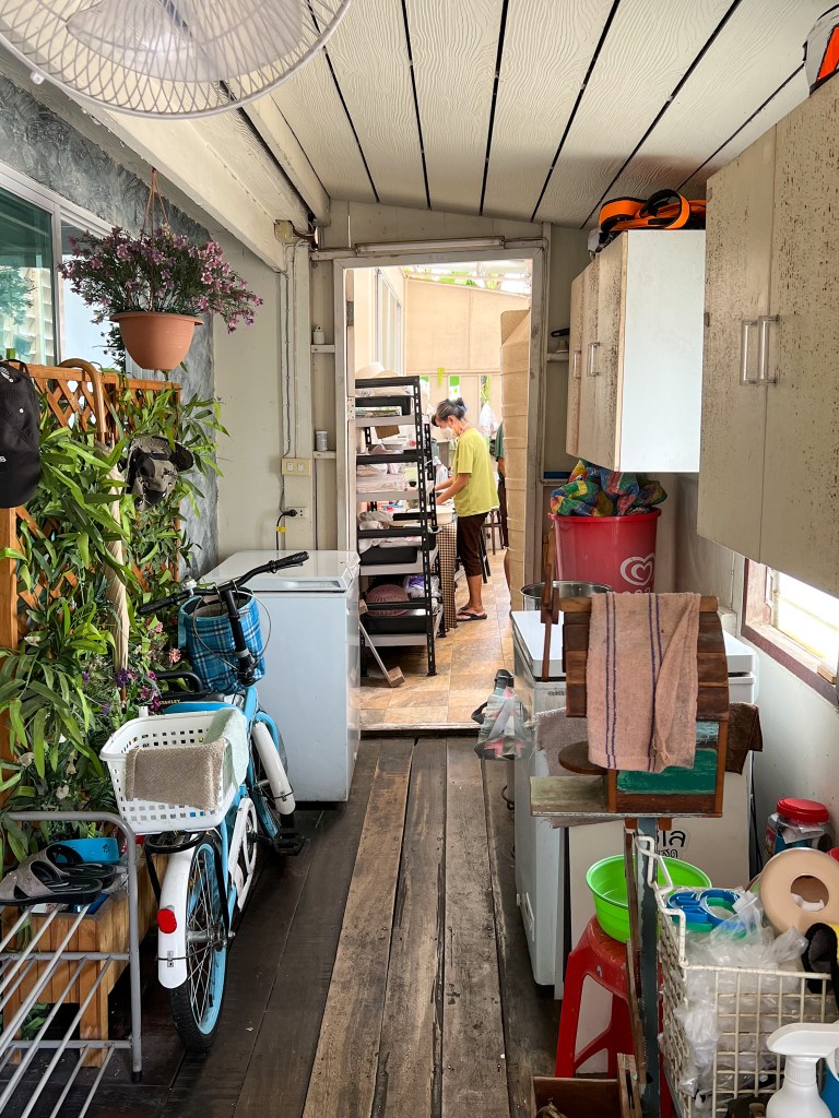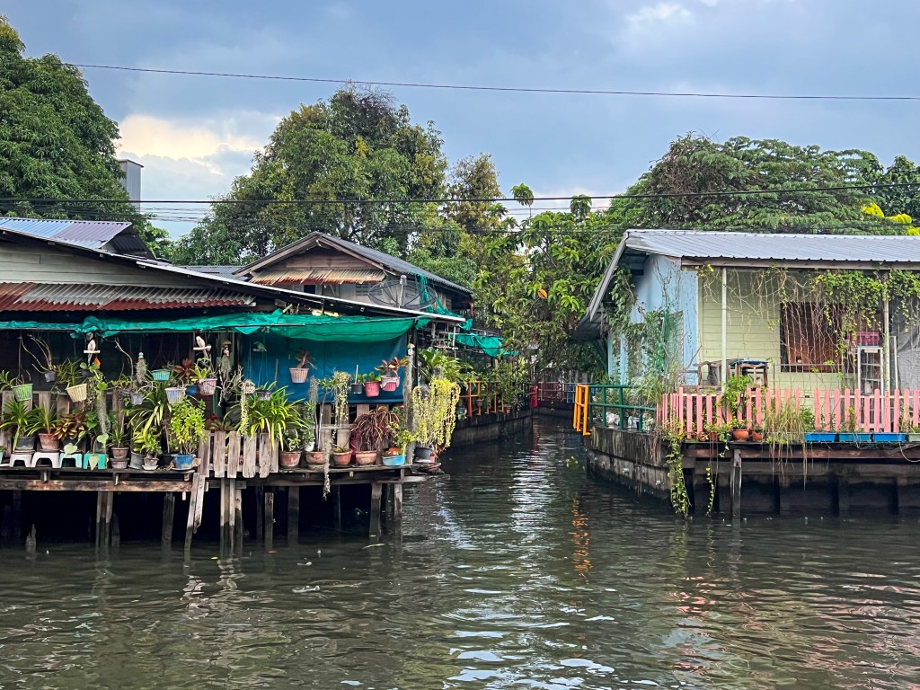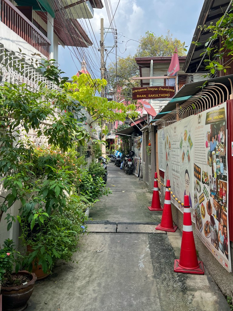 Am nächsten Tag stand eine Velotour mit kulinarischer Begleitung durch das alte Bangkok auf dem Plan. Mit unserem Guide Wat fuhren wir durch die engen Gassen, vorbei an Hauseingängen und den Kanälen entlang, wobei wir immer wieder thailändische Köstlichkeiten probierten und etwas historischen Kontext dazu erhielten. Zudem haben wir einige Tempel besucht und einen Grobabriss über den Buddhismus und die thailändische Kultur erhalten. Als es monsunartig zu schütten begann (offensichtlich war die Regenzeit noch nicht ganz vorbei), suchten wir Schutz bei einem Stand und probierten einheimische Früchte. Abgerundet wurde der ganze Nachmittag bzw. Abend bei einer thailändischen Familie, welche auch für die lokale Community kocht. Der Ausflug war echt super, da wir einen Eindruck darüber erhalten haben, wie der Alltag der Thais in Bangkok effektiv aussieht.