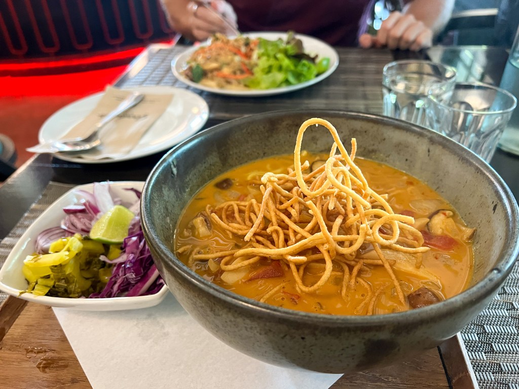 Von Bangkok schnappten wir uns den Flieger in den Norden Thailands – Chiang Mai. Am ersten Tag in Chiang Mai machten wir nicht viel, ausser die bekannte Suppe des Nordens namens „Khao Soi“ zu kosten. Dies ist eine Art Curry-Kokusnuss-Brühe mit Nudeln und diversen Suppeneinlagen. Richtig lecker!