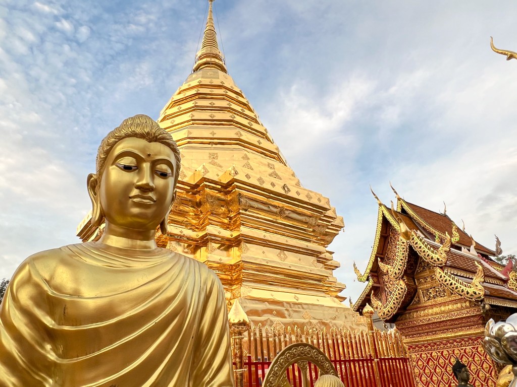 Der Tempel selbst war zum Sonnenuntergang gut besucht, aber trotzdem nicht überlaufen. Der vergoldete königliche Tempel war sehr ansehnlich und die Aussicht auf Chiang Mai war auch sehr schön.