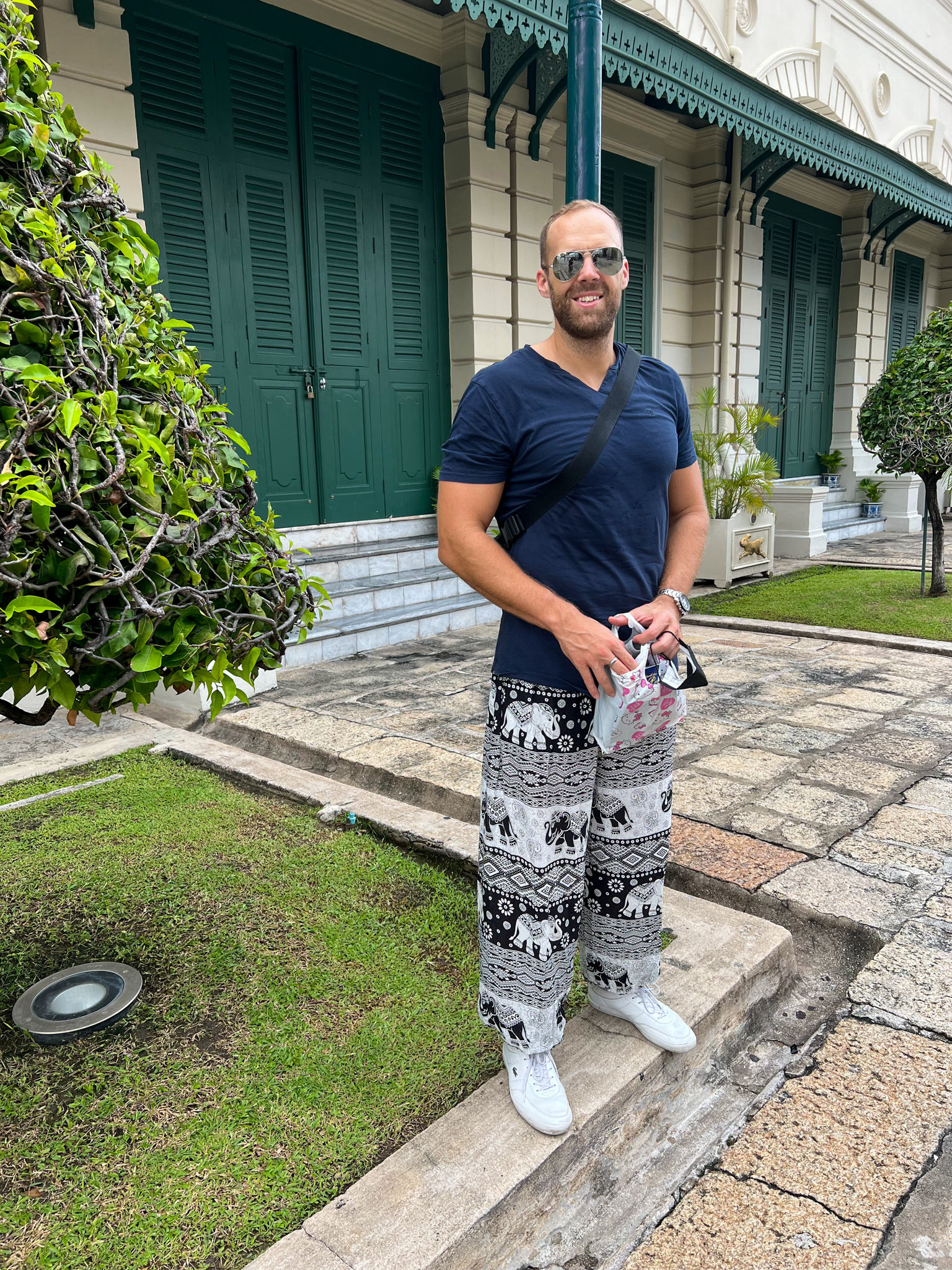Um diese üppige Mahlzeit zu verdauen, schlenderten wir während der Mittagszeit durch die Stadt an den Fluss und beobachteten währenddessen das Geschehen auf den Strassen. Mit dem lokalen Boot (welches übrigens ein Zwanzigstel des Touristenboots kostet) sind wir in Richtung des grossen Palasts gedüst. Dort angekommen, ergatterte sich Kevin Elefanten-Hippie-Hosen, da man diese Anlage nicht mit Shorts besuchen darf. War ein netter Anblick 😂.