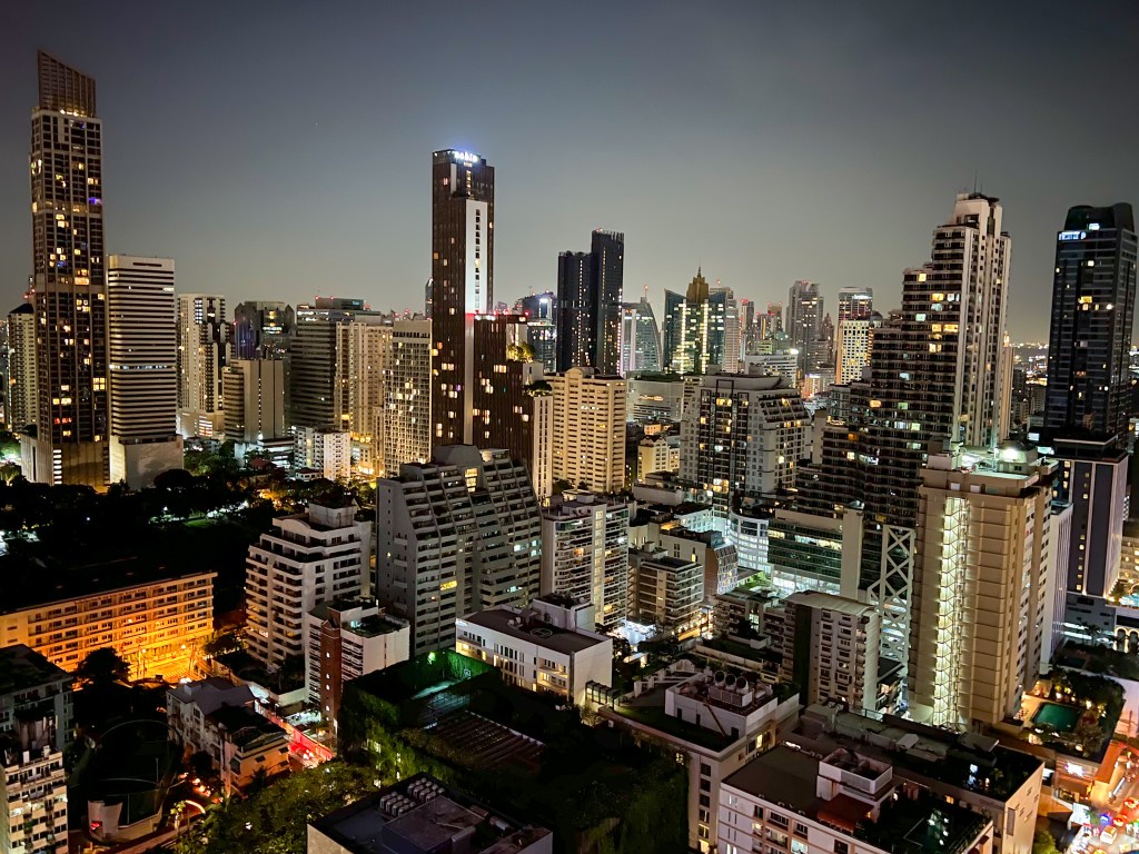 Am späteren Nachmittag, als ich wieder frisch und munter war während Kevin noch um sein Leben kämpfte, fuhren wir in das MBK Shoppingcenter, um Kevin lange Hosen für den bevorstehenden Abend zu besorgen. Schöne nämlich, keine Hippie-Hosen! Denn am Abend haben wir mit Pädi abgemacht, einem Freund von Kevins Eltern, welcher sich unter anderem in Bangkok niedergelassen hat. Er hat uns die Gegend rund um seine Wohnung gezeigt, wo viele Expats heimisch sind. So viel mir ist, hat der Stadtteil Sukhumvit geheissen. Zuerst besuchten wir eine Bar zum Apero, danach gab es etwas leckeres Westliches zu essen. Später besuchten wir die Rooftop Bar „Above Eleven“, von der man eine spektakuläre Aussicht auf die Skyline Bangkoks hatte. Abgerundet haben wir den Abend in einer versteckten Bar namens „Havana Social“, welche ganz nach dem Motto „Kuba“ eingerichtet worden ist. Dieser Abend war der (vorerst) perfekte Abschluss in einer liebgewonnenen Stadt. Einen herzlichen Dank an Pädi an dieser Stelle ☺️!