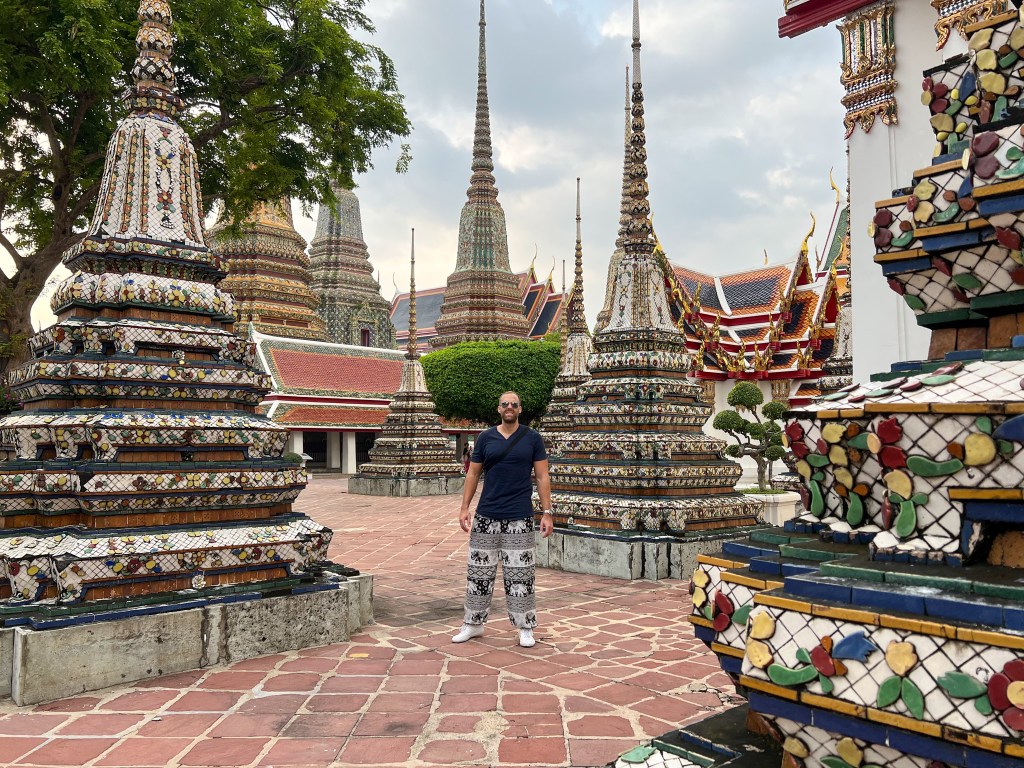 Nach einer kurzen Pause besuchten wir einen weiteren Tempel namens Wat Pho gleich nebenan. Dieser Tempel ist unter anderem bekannt für die 46 Meter lange und 15 Meter hohe vergoldete liegende Buddha-Statue. Da wir erst am späteren Nachmittag dort waren, hatte es fast keine Besucher mehr und wir konnten den Tempel in aller Ruhe besichtigen und bestaunen.