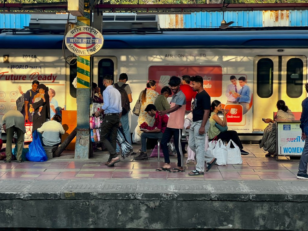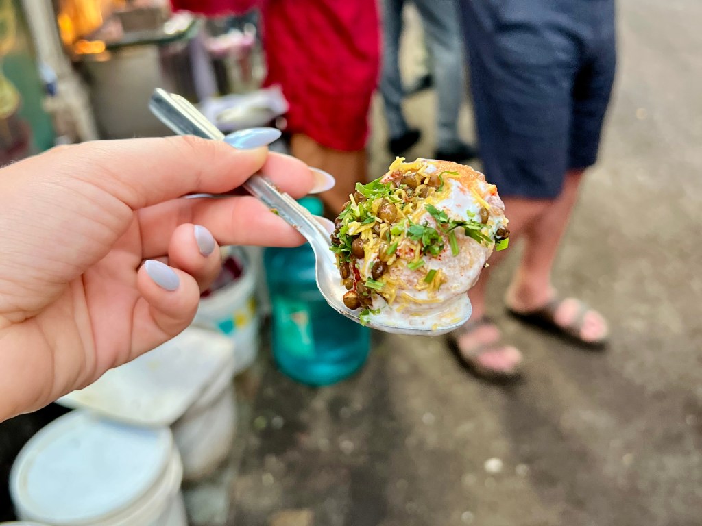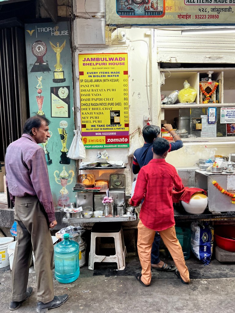 Angefangen hats mit einem „Vada Pav“, ein frittiertes Kartoffelpatty in weichem Brötchen mit verschiedenen Chutneys. War mega lecker. Im Anschluss nahmen wir einen Zug (mit offenen Türen, logisch) und begaben uns in einen anderen Stadtteil, um die Tour von dort aus fortzusetzen.