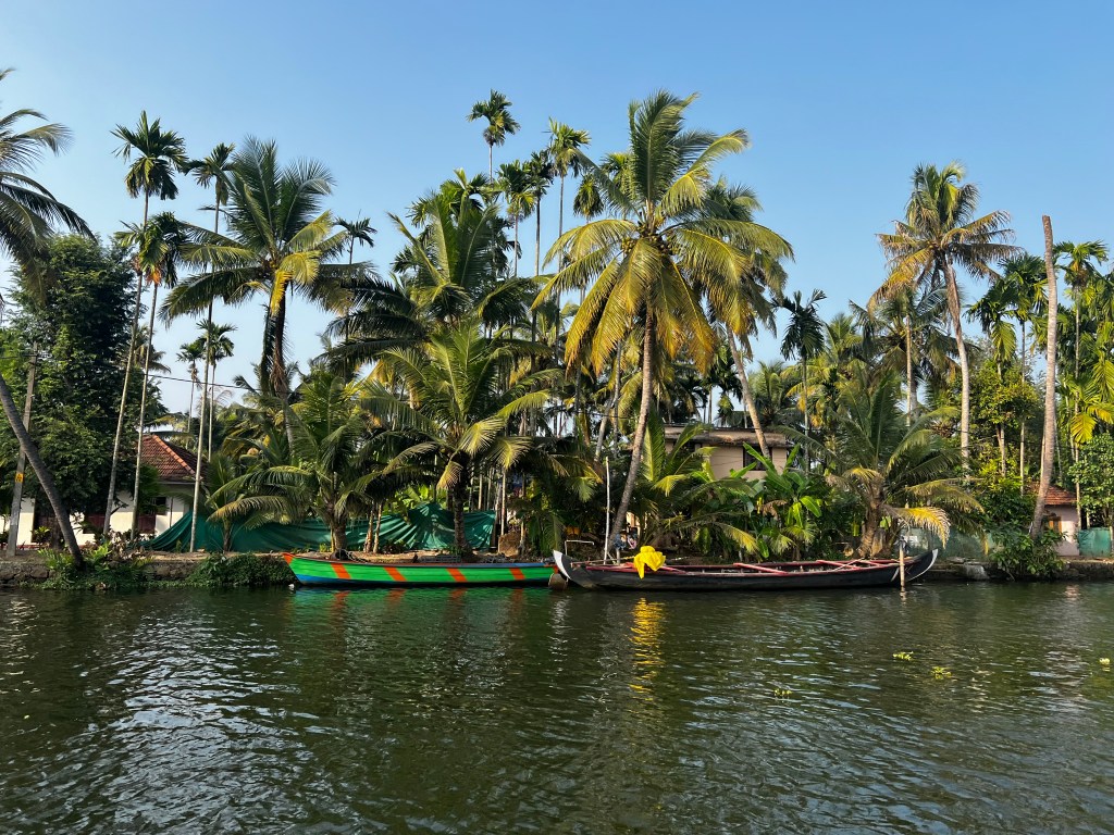 Da wir uns ja auf der Hochzeitsreise befanden, gönnten wir uns ein nettes Zimmer auf Thara’s Houseboat und verbrachten den Nachmittag sowie die Nacht auf den Kerala Backwaters, welche aus idyllischen Kanälen, Flüssen und Seen bestehen, gesäumt von Palmen, Reisfeldern und vereinzelt auch von Tempeln, Kirchen und Häusern.