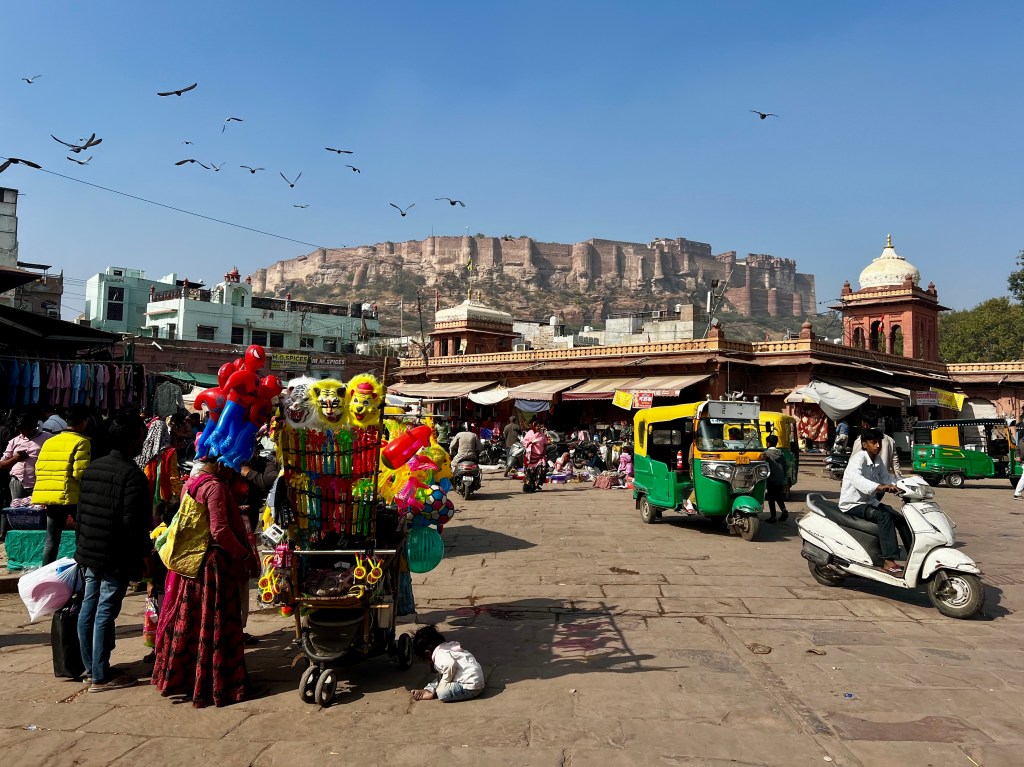 Da man mit dem Auto auch nicht in die Altstadt von Jodhpur fahren durfte (wo sich unser Hotel befand) hat uns der Fahrer beim Clocktower vor der Altstadt rausgelassen, wo gerade der abendliche Markt stattfand. Also navigierten wir mit unseren Koffern durch die Massen an Menschen, Waren, Roller und Tuktuks. Glücklicherweise stellten wir fest, dass obwohl unser Hotel sehr zentral lag, es dennoch sehr ruhig war.