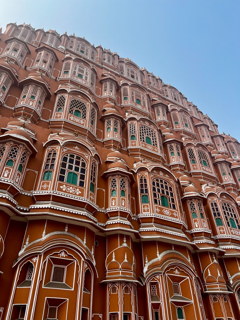 Gut ausgeschlafen starteten wir unseren Tag mit Brunch. Während ich mir was Leichtes aussuchte, wirkte Kevin der Magenverstimmung mit Gipfeli und Schoggiwaffeln entgegen. Im Anschluss brausten wir mit dem Tuktuk in das belebte Zentrum der Stadt, welche auch als „Pink City“ bekannt ist (wobei es für mich eher eine Orange City war, aber whatever). Zuerst erhaschten wir einen Blick auf das wohl bekannteste Wahrzeichen der Stadt, dem Hawa Mahal, welches über ganze 953 Fenster verfügt und wunderschön anzuschauen ist.