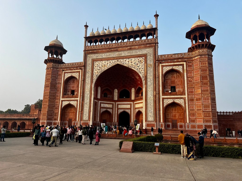 Der ursprüngliche Plan war, dass wir uns das Taj Mahal am nächsten Morgen zum Sonnenaufgang anschauen werden. Da Nordindien im Januar jedoch sehr neblig ist, hätten wir am morgen früh wohl weder Sonne noch das Taj Mahal wirklich gesehen. Darum deponierten wir unser Gepäck kurzerhand im Hotel und machten uns gleich auf den Weg. Auf dem 10-minütigen Fussmarsch zum Taj Mahal mussten wir jenste Guides und Warenverkäufer abwimmeln, bis wir es dann endlich zum Eingang geschafft hatten.